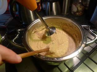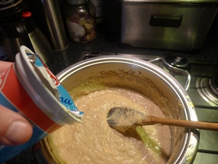 Mäso nakrájame na menšie kúsky a spolu s cibuľou orestujeme na maslei. Podlejeme vývarom. Privedieme do varu na strednom plameni. Rozmixujeme na úplne jemno. Vmiešame kyslú smotanu alebo majonézu.