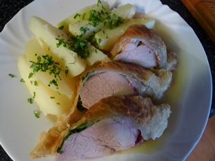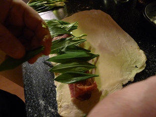 Obalíme ju slaninkou, medvedím cesnakom a lístkovým cestom. Je to vynikajúca kombinácia a aj na tanieri má krásnu farbu.