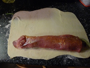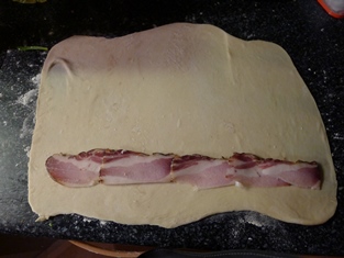 Panenku opláchneme a osušíme. Odblaníme. Osolíme a opaprikujeme mletou červenou paprikou. Lístkové cesto si vyvaľkáme. Položíme naň kúsky prerastenej slaniny. Na ne potom položíme panenku.