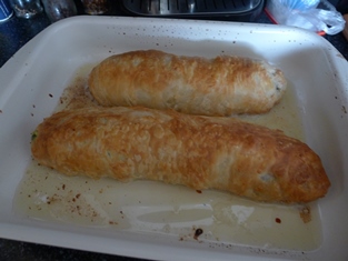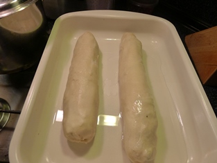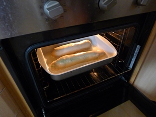 Panenku pokryjeme listami medvedieho cesnaku a opatrne zavinieme. Položíme na nepriľnavý plech. Povrch cesta jemne potrieme olejom, aby hneď nezačalo chytať farbu. Pekáč prikryjeme alobalom. Vložíme do rúry vyhriatej na 220°C. Pečieme asi pol hodiny.