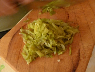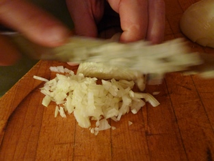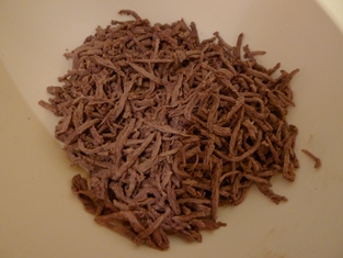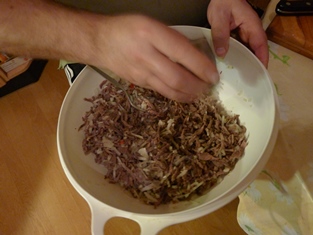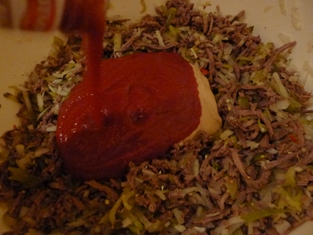 Mäso nakrájame na veľmi tenké rezance. Pridáme na veľmi jemno nasekané feferónky s cibuľou. Premiešame rukami, aby sme veľmi nepokazili tvar mäsa. Osolíme - mierne a okoreníme. A zase premiešame.