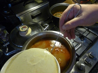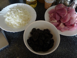 Na masti si orestujeme do sklovita na jemno pokrájanú cibuľu. Prisypeme slivky a mäso nakrájané na kocky. Premiešame a orestujeme. Primiešame na špičku noža mletého čierneho korenia a kávovú lyžičku soli a polievkovú lyžicu medu a 2 bobkové listy.. Premiešame a ešte chvíľu orestueme.