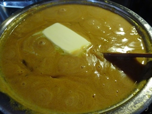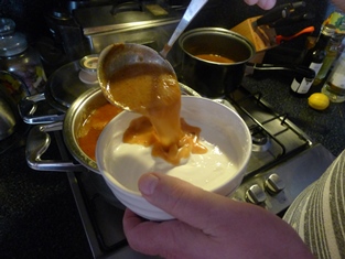 Medzitým si urobíme zmes na zahustenie z 500 ml kyslej smotany a 1 polievkovej lyžice majzeny. Dobre rozmiešame. Keď je mäso mäkké, odoberieme do smotanovej zmesi trochu tekutiny a premiešame. Takto pripravené vmiešame do hrnca. Opatrne premiešame a na miernom plameni necháme prevrieť asi 10 minút.