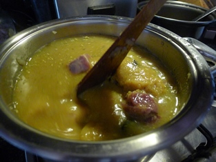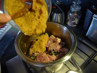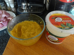 2 väčšie cibule, 250 g sliviek, 1 kg bravčového pliecka, 500 g koreňovej zeleniny (uvarenej vo vývare alebo vo vode a rozmixovanej na jemno), 2 polievkové lyžice kokosovej masti