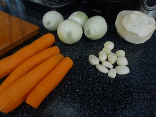 Budeme potrebovať 2 polievkové lyžice masti, 4 väčšie mrkvy, 4 veľké žlté alebo biele cibule, 8 - 10 strúčikov cesnaku, 1 menšiu hlavu zeleru, asi 5 cm dlhú vetvičku petržlenu, 1 čajovú lyžičku soli a 1/2 čajovej lyžičky mletého čierneho korenia.