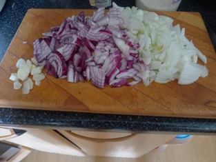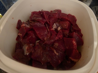 Nakrájame si 1 kg jelenieho stehna na kocky. Nakrájame na malé kocky 2 papriky, 2 paradajky.