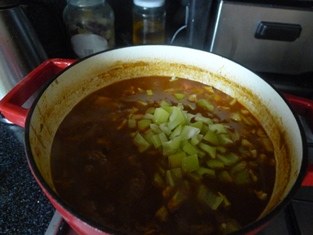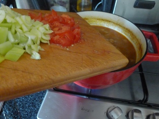 Pridáme nakrájané mäso. Zalejeme vývarom toľko, aby sme zakryli mäso. Necháme dusiť pod odchýlenou pokrievkou asi hodinu. Primiešame paradajky a papriky. Necháme ďalej dusiť asi hodinu.