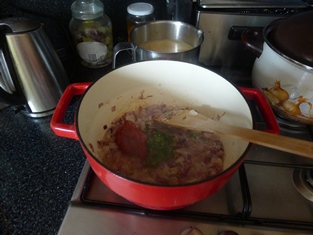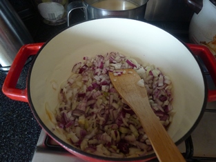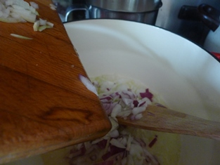 Na rozpálenom oleji opečieme nakrájanú cibuľu a 3 strúčiky cesnaku. Prilejeme pretlak a premiešame spolu s nakrájanou bazalkou a rozmarínom. Osolíme a premiešam.Necháme dusiť a pripravíme si zvyšné ingrediencie.