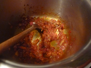 Hrniec jemne vytrieme pierkom olejom. Zasypeme na drobno posekanou veľkou cibuľou a asi tromi strúčikmi cesnaku. Posypeme 1 polievkovou lyžicou mletej červenej papriky, mierne mletým čiernym korením a asi 1 čajovou lyžičkou soli. Premiešame. Zakryjeme pokrievkou a necháme asi 1 minútu podusiť.