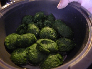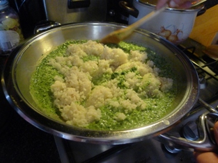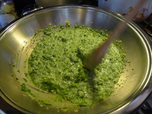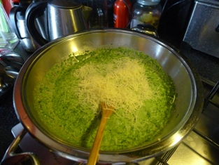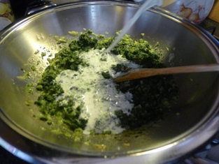 Osolíme a okoreníme. Pridáme rozpustený špenátový pretlak. Premiešame. Necháme prevrieť. Zalejeme mliekom.