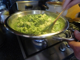 Vmiešame polovicu nastrúhaného syra a ryžu. Pridáme zvyšok pretretého cesnaku. Premiešame. Chvíľu podusíme, kým nám nestuhne. Dochutíme zase soľou a korením.