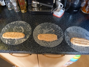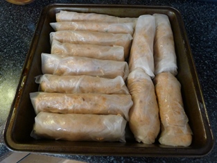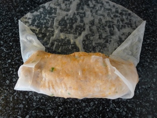 Naporcujeme do ryžových "papierov" a zabalíme - zvinieme do rolky. Pripravíme si rolky do pekáča. Postupne opečieme na grilovacej panvici zo všetkých strán.