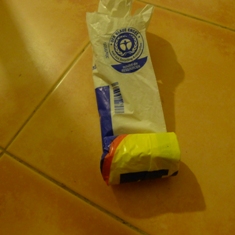 Stočíme tuho poskladanú igelitovú tašku - takú rôznofarebnú. Zabalíme ju dobre do papiera na pečenie a položíme na pekáč.
