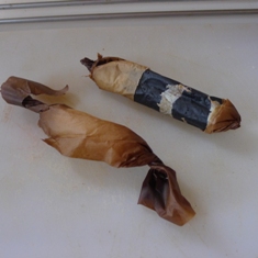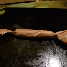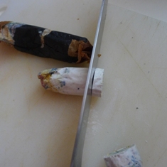 Vyberieme vychladené igelitky, odbalíme z papiera a nakrájame. Museli sme použiť vykosšovací nôž - dobre ostrý. Možno by bola lepšia pílka.